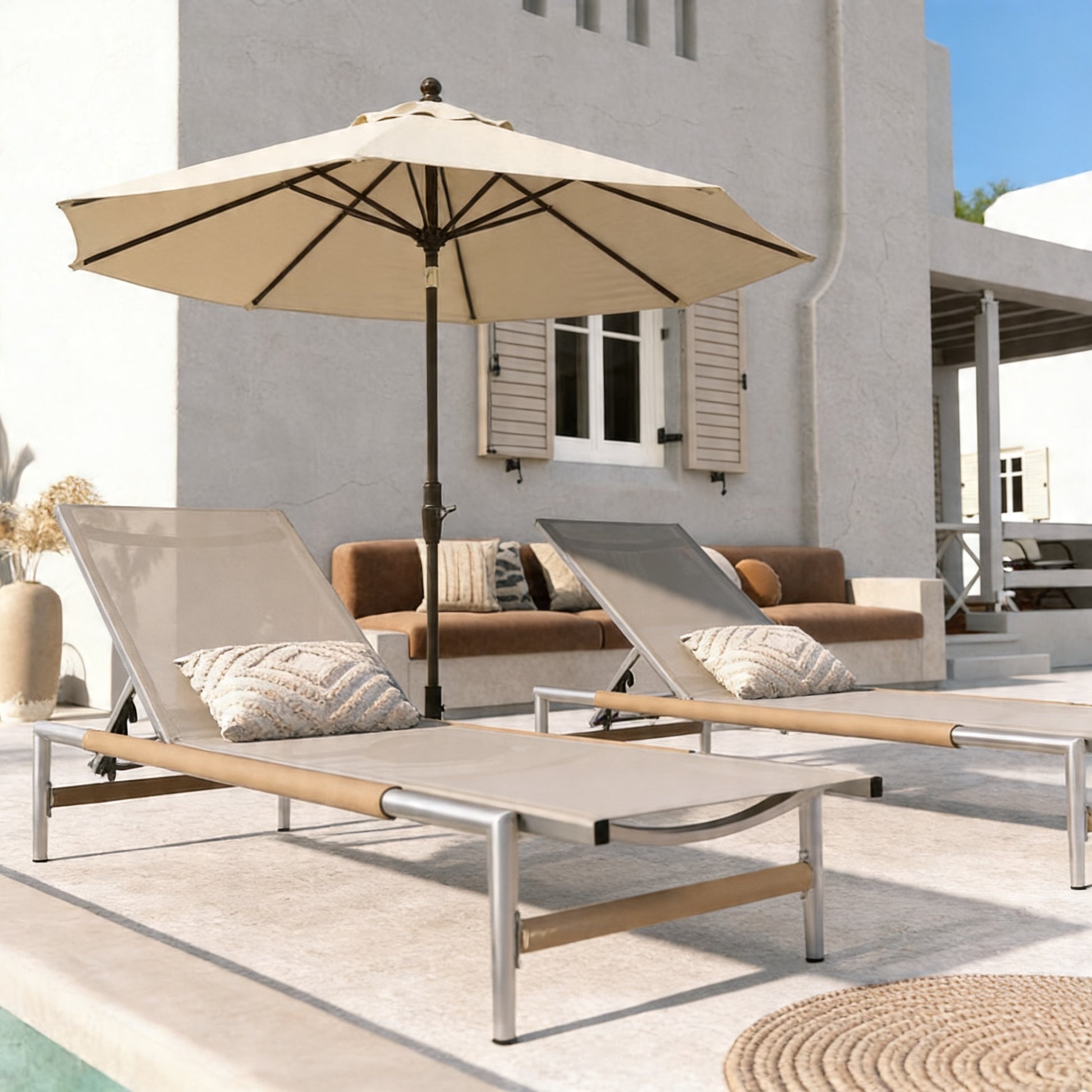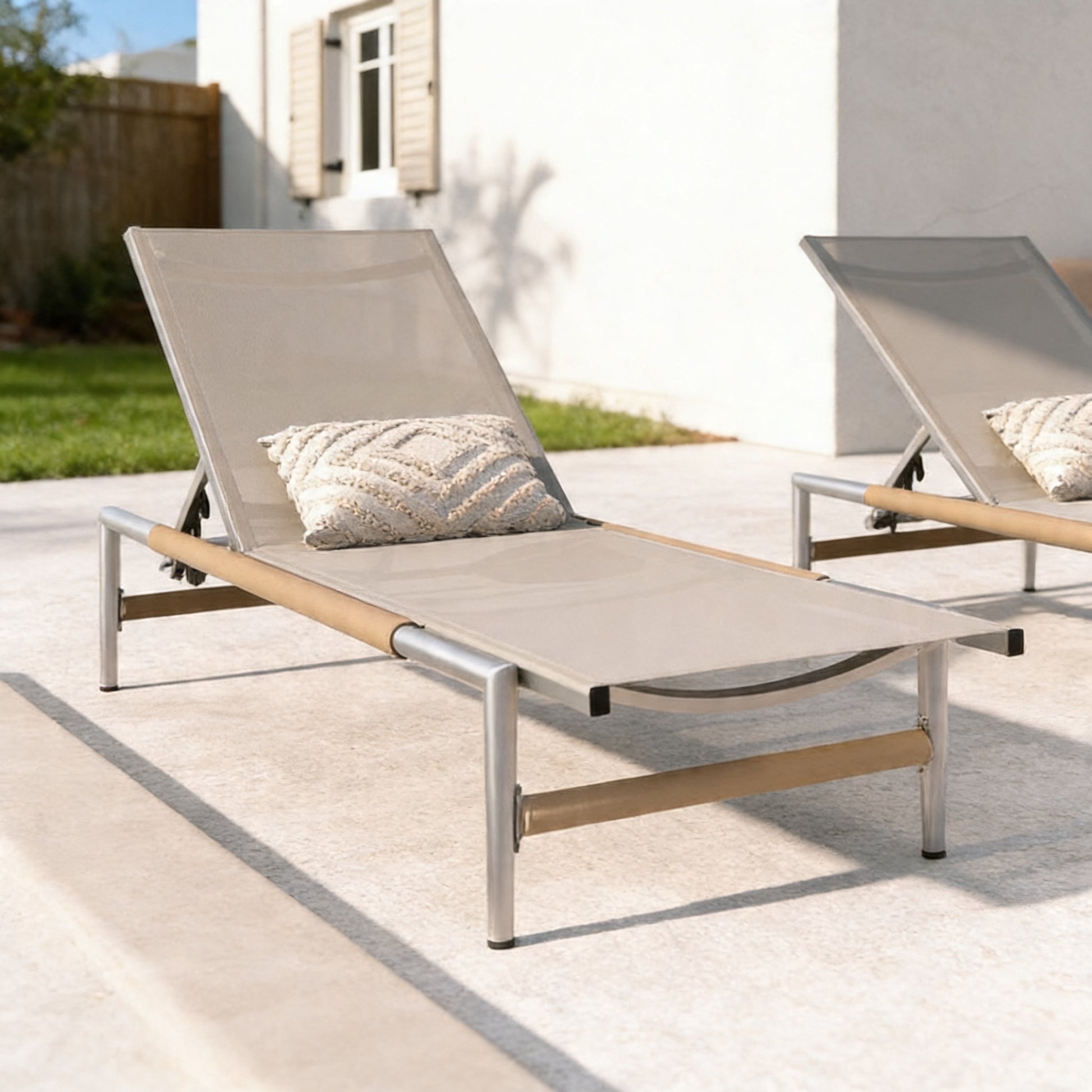 A simple and modern pair of chaise lounges designed for comfort and durability. The lightweight aluminum frame makes them easy to position, while the clean design works across a range of outdoor spaces.